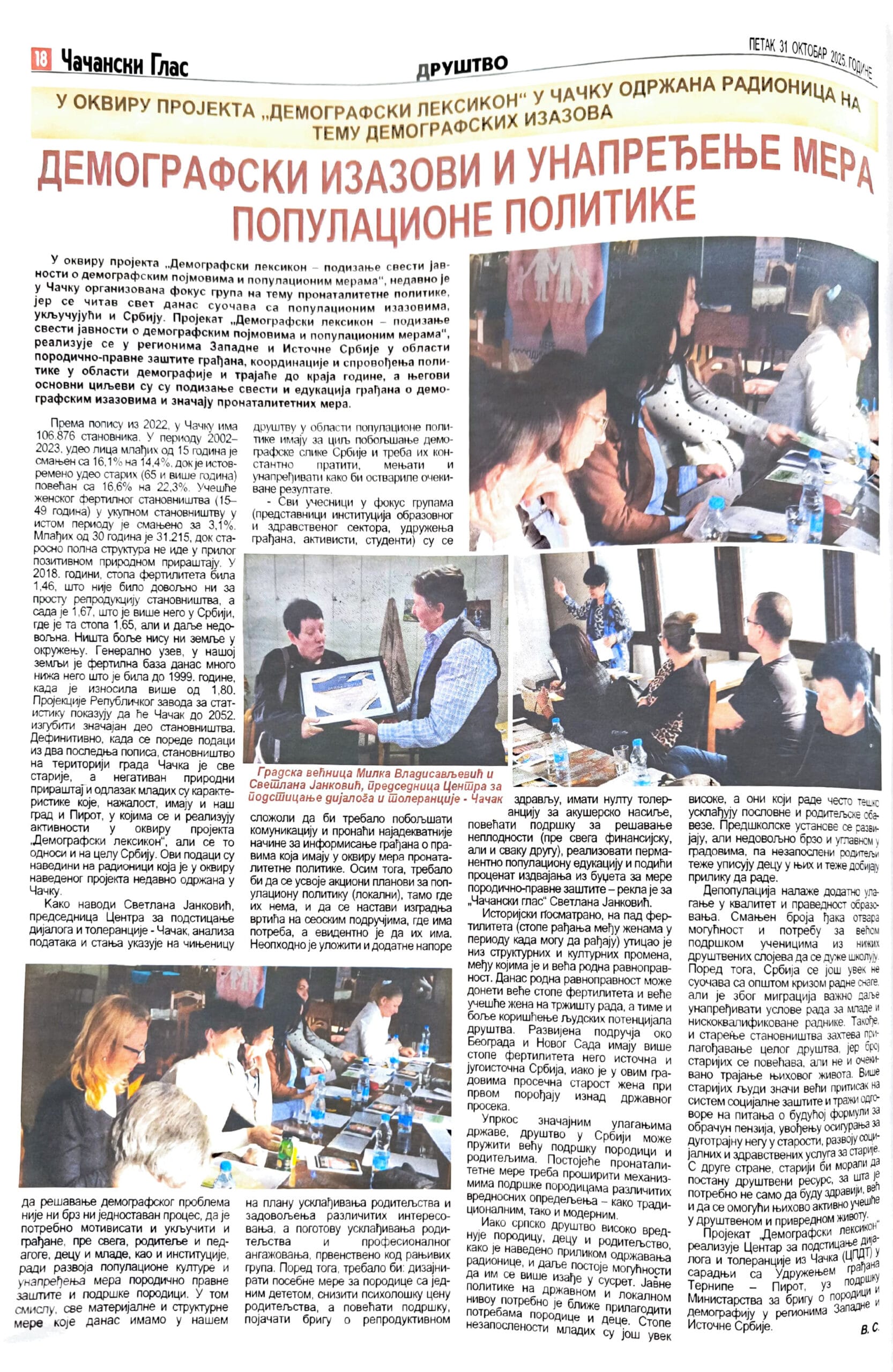 Центар за подстицање дијалога и толеранције из Чачка је, у партнерству са удружењем грађана Тернипе из Пирота и у сарадњи са градским извршним органима и институцијама градова Пирот и Чачак, реализовао пројекат под називом “ДЕМОГРАФСКИ ЛЕКСИКОН – подизање свести јавности о демографским појмовима и популационим мерама“, у периоду од септембра до децембра 2025. године.